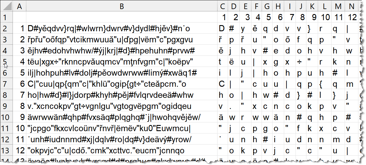 - A \(\displaystyle \textbf{C2}:\textbf{AP41}\) tartomány celláiban bontsuk fel betűkké a kódolt üzenet sorait.