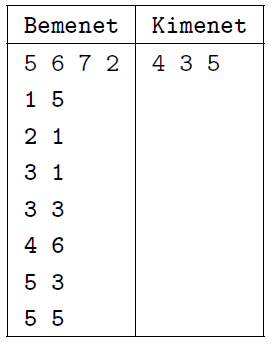 A program standard bemenetének első sorában az asztal oldalainak hossza (\(\displaystyle {1\leq N}, {M\leq 100}\)), a robotjárművek száma (\(\displaystyle {1\leq DB\leq 1000}\)) és a vizsgált időtartam (\(\displaystyle {1\leq T\leq 100}\)) szerepel. A következő \(\displaystyle DB\) sor egy-egy jármű indulási helyét (\(\displaystyle {1\leq X_i\leq N}\), \(\displaystyle {1\leq Y_i\leq M}\)) tartalmazza egy-egy szóközzel elválasztva.