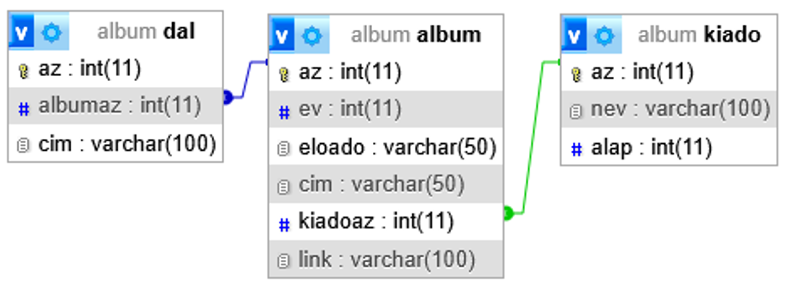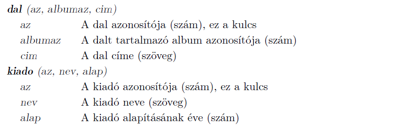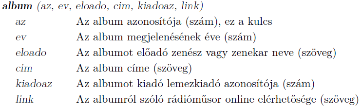 I. 669. A régi magyar könnyűzenei albumokat játszó rádióadó az elmúlt öt évtized kiadott lemezeiből választott ki 50-et. Ebben a feladatban a kiválasztott albumokhoz, az albumokon szereplő dalokhoz és az albumokat megjelentető lemezkiadókhoz kapcsolódó feladatokat kell megoldanunk. Az adatbázis a következő táblákat tartalmazza:
