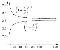 \) The ratio of the increasing lower estimate and decreasing upper estimate clearly tends to 1. Hence the two functions have a common limit at infinity (Figure 5). If that common limit (which we can now denote by e) is chosen as the base of the exponential function, the tangent at (0,1) will indeed enclose an angle of 45o with the x-axis. This is the property of the number e that makes it appear in so many areas of mathematics. Figure 5 The slope at (0,1) is not the only interesting thing about the function ex. The slope at any point (x,ex) is equal to ex, or in other words (ex)'=ex. This is an immediate consequence of the above property. The purpose of this paper has been to show why the limit of the sequence \(\displaystyle \left(1+\frac{1}{n}\right)^{n}\) is so special, why this number is the right choice for the base of the exponential and logarithmic functions. Textbooks, where clarity and precision are essential, usually present the case in a different order. The number e is defined well before tangents and their slopes are mentioned. First it is proved in the section on limits that the sequence \(\displaystyle \left(1+\frac{1}{n}\right)^{n}\) is convergent, and its limit is denoted by e. It is only later, after the introduction of the concepts of the limit of a function and continuity, that the interesting property of the function ex in terms of differentiation becomes apparent. 1. Let n be an arbitrary positive integer. Prove from first principles that \(\displaystyle \left(1+\frac{1}{n}\right)^{n}<3\). 2. Prove that \(\displaystyle