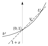 \) Let \(\displaystyle b=\left(1+\frac{1}{u}\right)^{u}\). The graph of the function x\(\displaystyle \mapsto\)bx passes through the point \(\displaystyle U=\left(\frac{1}{u},1+\frac{1}{u}\right)\) (Figure 3). Figure 3 Convexity implies that the point \(\displaystyle V=\left(\frac{1}{v},1+\frac{1}{v}\right)\) is above the graph of the function bx, that is, \(\displaystyle 1+\frac{1}{v\)b^{\frac{1}{v}}">. Taking the v-th powers, \(\displaystyle