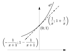 To obtain close estimates for the number a, we are going to use points of the tangent close to (0,1). Let x be a large positive real number and consider the point \(\displaystyle \left(\frac{1}{x},1+\frac{1}{x}\right)\). Since the curve is convex, the whole tangent is below the graph (except at the point of tangency, see Figure 2). Thus \(\displaystyle a^{\frac{1}{x}\)1+\frac{1}{x}">, and \(\displaystyle \)\left(1+\frac{1}{x}\right)^{x}"> by raising to the x-th power. For another estimate, consider the point \(\displaystyle \left(-\frac{1}{x+1}, 1-\frac{1}{x+1}\right)\). This point is also below the graph, therefore \(\displaystyle a^{-\frac{1}{x+1}\)1-\frac{1}{x+1}">. This time, raising to the power of -(x+1) will reverse the sign since the exponent is negative: