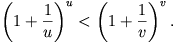 \left(1+\frac{1}{u}\right)^{u}<\left(1+\frac{1}{v}\right)^{v}.