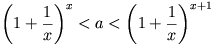 \(\displaystyle a<\left(1-\frac{1}{x+1}\right)^{-(x+1)}= \left(1+\frac{1}{x}\right)^{x+1}. \)