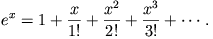 e^x=1+\frac{x}{1!}+\frac{x^2}{2!}+\frac{x^3}{3!}+\cdots\,.