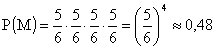 Minden más esetben van 6-os a dobások között, tehát P(B) = 1-P(M)