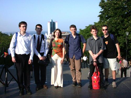 ![]() A magyar csapat a híres Patyomkin-lépcső tetején. (Balról jobbra: Drozdy Árpád, Soós Péter, az ukrán egyetemista csapatkísérő, Botyánszki Vince, Mihók Péter és Zsarnóczay Ádám.) Háttérben a Fekete-tenger. |