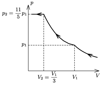 \(\displaystyle p_{2}=\frac{11}{5}p_{1}=123{,}9~{\rm kPa}\qquad\text{\'es}\qquad V_{2}=\frac{V_{1}}{3}=5~\rm dm^{3}. \)