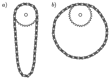 1. feladat. Egy fogaskerék tengelyét vízszintesen rögzítjük és ráhelyezünk egy kerékpárláncot az 1/a) ábrán látható módon, majd a fogaskereket a tengelye körül óvatosan forgatni kezdjük. Milyen alakot vesz fel a lánc, amikor a fogaskerék már állandó szögsebességgel sebesen forog?
