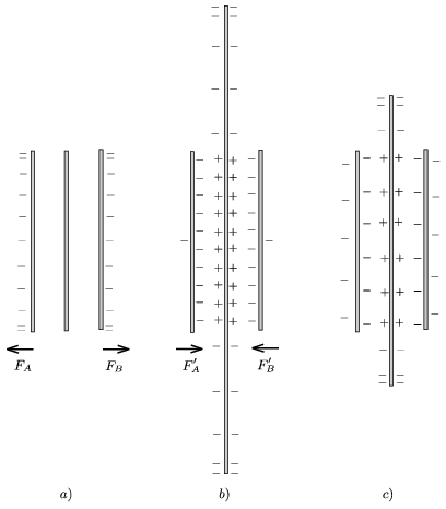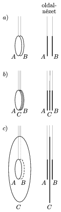 \) vagyis azok számára, akik kihasználták, hogy normál légköri nyomáson a nitrogén forráspontja 77,4 K, a megadott p1 = 56,3 kPa adat felesleges volt. 3. feladat. Két egyforma, mondjuk 5 cm átmérőjű, vékony lemezből készült fémkorong (A és B) szigetelő fonálon függ pontosan egymással szemben, párhuzamosan, egymáshoz közel, pl. 2 mm távolságban, az a) ábrán látható módon. Mindkét korongnak ugyanakkora, kellőképpen kicsiny q elektromos töltést adunk. (Mivel q kicsi, sem a korongok parányi elmozdulása, sem a levegőn át történő kisülések veszélye nem okoz bonyodalmat.) Kezdetben természetesen mindkét korongra hat a másik korong taszító ereje. 4. ábra Fizika szakkörön az elektromos árnyékolás a téma. A két korongot nézve Beának az az ötlete támad, hogy ha az A és B korong közé óvatosan (ügyelve, hogy egyikhez se érjen hozzá) egy ugyanolyan, de elektromosan semleges C fémkorongot eresztünk be szigetelő fonálon a b) ábrának megfelelően, akkor az ,,leárnyékolja'' mindkét eredeti korongnak a másikra gyakorolt hatását, ezért mind az A-ra, mind a B-re ható erő gyakorlatilag nullára csökken. Gabi figyelmeztet rá, hogy az elektromos mező nagyobb tartományra terjedhet ki, mint a töltött testek mérete, ezért Bea ötletét úgy módosítja, hogy a C korong átmérője legyen pl. 25 cm, ahogy a c) ábrán látható. (Az ábra nem méretarányos.) Gabi szerint csak ekkor csökken elhanyagolható értékre az A-ra, illetve B-re ható elektromos erő. a) Mit tapasztalnánk, ha Bea ötletét követve A és B közé velük egyenlő méretű, semleges C fémkorongot engednénk, majd megmérnénk az A-ra, illetve B-re ható erőt? b) Mi lenne az eredmény, ha Gabi javaslatát ellenőriznénk méréssel? c) Elképzelhető-e olyan méretű semleges C korong, amelynek alkalmazásával az A-ra, illetve a B-re ható erő pontosan zérussá válik? (Károlyházy Frigyes) Megoldás. a) A középre leengedett fémkorongon nem alakulhat ki töltésmegosztás, mert a korong (fém!) belsejében nem lehet szabad töltés, felületén pedig nem léphet fel kétféle előjelű töltés a szimmetrikusan, ugyanakkora korongokon elhelyezkedő, azonos előjelű töltések hatására. Ezért Bea ötlete nem jó, a két feltöltött korongra ható erő nem változhat meg. Ugyanúgy taszítanák egymást a semleges C fémkorong leeresztése után, mint addig. b) Itt, a nagyméretű C korong esetén már érvényesülhet a töltésmegosztás. A középső korongnak a másik két koronggal szemközti részein q-val ellentétes töltés alakul ki mindkét oldalon. Ugyanakkora, q-val azonos előjelű töltés lép fel a nagy C korong széle felé, úgyhogy az össztöltés továbbra is nulla marad. Viszont a töltött korongokra most a nagy korongon megosztott (influált), q-val ellentétes előjelű töltések vonzó erőt fejtenek ki, és ez nagyobb, mint a taszító erő. A két töltött korongra ható erő éppen ellentétes irányú lesz, mint addig, amíg nem volt közöttük a nagy korong. c) Gondolatban fokozatosan növeljük a középső korong átmérőjét 5 cm-ről 25 cm-re. A kezdeti taszító erő csökkenni kezd, míg végül - folytonosan változva - vonzó erőbe megy át. Közben, valamekkora átmérőnél tehát éppen zérus a töltött korongokra ható erő. Hogy ez mekkora átmérőnél következik be, azt egy kicsit bonyolultabb számítással lehet csak meghatározni; ezt azonban nem várta el a versenybizottság a megoldóktól (Megjegyzés: A ,,kritikus'' korongméret középiskolás eszközökkel történő kiszámítására a KöMaL egy későbbi számában még visszatérünk. - A Szerk.) 5. ábra Tájékozódásul vázoljuk a három esetben kialakuló töltéseloszlást (5. ábra), feltéve, hogy eredetileg negatív töltést adtunk a korongoknak. (Az ábrák nem méretarányosak.) Kiegészítések (Kalina Kende ötlete alapján): a) eset: Vegyük a három korong burkolóhengerét. Képzeljük azt, hogy ez a ,,lapos'' henger teljes egészében homogén vezető. Vigyünk fel rá 2q töltést, ezek legnagyobb része henger véglapjain jelenik meg, csak egy kis része kerül a henger palástjára. Ha ezután eltávolítjuk a hengernek azt a részét, ami nem a három korong, akkor látszik, hogy a középső korongon nincs töltés, így nem befolyásolja az A és B korong közötti erőhatást. b) eset: Ha a középső korong végtelen nagy lenne, akkor a tükörtöltés módszerét alkalmazva jól látszana, hogy A-ra és B-re is vonzóerőt fejt ki a középső fémsík, miközben az A és B közötti kölcsönhatás már nem is lép fel. Most ugyan nem végtelen nagy a középső korong, de területe a kis, töltött A és B korong területének 25-szöröse, távolsága a kis korongoktól 1-1 mm, ami átmérőjének 250-ed része. Vagyis a C korong közepén influált, az A és B töltésével ellenkező előjelű töltés vonzó hatásának kell érvényesülnie ebben az esetben is. * A verseny ünnepélyes eredményhirdetésére és a díjak kiosztására 2010. november 26-án került sor az ELTE TTK Bolyai János termében. Meghívást kaptak erre az 50 és a 25 évvel ezelőtti Eötvös-versenyek nyertesei is, akik közül Dömölky (akkor még Elsner) Gábor, Grad János, Kós Géza, Pfeil Tamás és Tasnádi Tamás tudtak eljönni, és emlékeztek vissza néhány keresetlen mondatban saját versenyélményeikre. A megjelentek kivetítve láthatták az 50 és 25 évvel ezelőtti verseny feladatait és a 25 évvel ezelőtti nyerteseknek a KöMaL-ban akkor megjelent fényképeit. Ezután következett az idei feladatok ismertetése, a megoldások bemutatása, melyben csaknem a teljes versenybizottság részt vett. Radnai Gyula ismertette a megoldásokat, ezeket az első feladatnál Vigh Máté, a másodiknál Honyek Gyula egészítette ki, az itt is olvasható módon. A második és a harmadik feladathoz