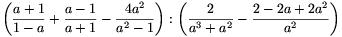 \(\displaystyle \left(\frac{a+1}{1-a}+\frac{a-1}{a+1}-\frac{4a^2}{a^2-1}\right) :\left(\frac{2}{a^3+a^2}-\frac{2-2a+2a^2}{a^2}\right) \)