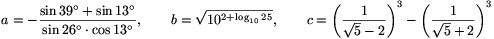 \(\displaystyle a=-\frac{\sin39^\circ+\sin13^\circ}{\sin26^\circ\cdot\cos13^\circ},\qquad b=\sqrt{10^{2+\log_{10}25}},\qquad c= \left(\frac{1}{\sqrt{5}-2}\right)^3-\left( \frac{1}{\sqrt{5}+2}\right)^3 \)