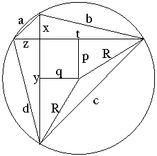 Az ábra jelöléseit használva: 8=a2+b2+c2+d2=2(x2+y2+z2+t2)=((y+x)2+(y-x)2+(t+z)2+(t-z)2)=4((R2-q2)+p2+(R2-p2)+q2)=8R2, tehát a körülírt kör sugara egységnyi.