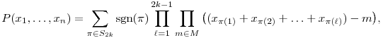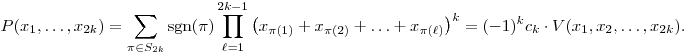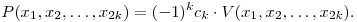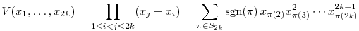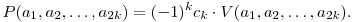 (A (-1)k előjel egy kis magyarázatra szorul. A szorzatban a Vandermonde-polinom tagjai közül az x12k-1x22k-2...x2k-1 szerepel a legtöbbször; a Vandermonde-polinomban ennek a tagnak az együtthatója (-1)k.)