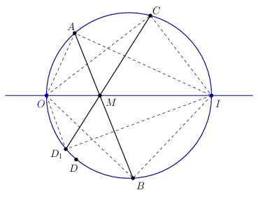 A feladatban előírt tulajdonság bizonyításához tekintsünk a körön négy tetszőleges, \(\displaystyle O\)-tól és \(\displaystyle I\)-től különböző pontot: \(\displaystyle A,B,C,D\)-t. Legyen az \(\displaystyle AB\) és \(\displaystyle OI\) egyenesek metszéspontja \(\displaystyle M\). (Ha \(\displaystyle AB\) és \(\displaystyle OI\) párhuzamos, akkor legyen \(\displaystyle M\) az \(\displaystyle OI\) egyenes ideális pontja.) A \(\displaystyle CM\) egyenes és a \(\displaystyle \mathcal{K}\) kör második, \(\displaystyle C\)-től különböző metszéspontja legyen \(\displaystyle D_1\). (Ha \(\displaystyle CM\) érinti a kört, akkor \(\displaystyle D_1=C\).)