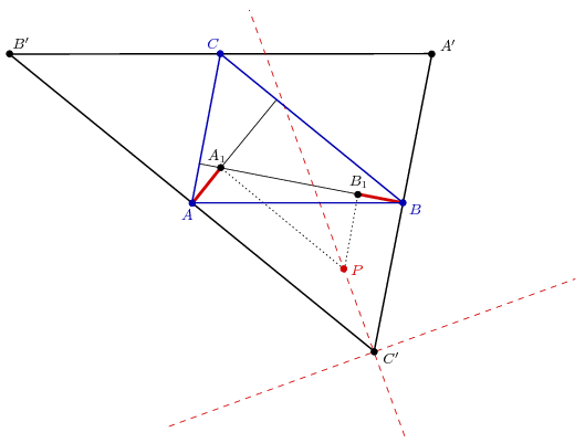 Az AA1 szakasz merőleges BC-re és a vele párhuzamos, A-n átmenő B'C' egyenesre, továbbá PA1-re. Ezért az AA1 szakasz hossza azonos a P pont és a B'C' egyenes távolságával. Hasonlóképpen, BB1 egyenlő a P pont és az A'C' egyenes távolságával. Ez a két távolság akkor egyenlő egymással, ha P a B'C' és A'C' egyenesek valamelyik szögfelezőjén van.