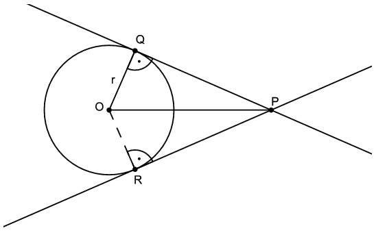 Megoldás. Készítsünk ábrát. Mivel egy körhöz húzott érintő merőleges az érintési pontba húzott sugárra, így \(\displaystyle PQO\sphericalangle=PRO\sphericalangle=90^{\circ}\).