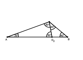2.) Ia. és III.b., vagyis \(\displaystyle \gamma=3\alpha\) és \(\displaystyle \alpha=2\beta\). Ekkor \(\displaystyle 180^{\circ}=2\beta+\beta+6\beta\), amiből \(\displaystyle \beta=20^{\circ}\) és így \(\displaystyle \alpha=40^{\circ}\) és \(\displaystyle \gamma=120^{\circ}\).