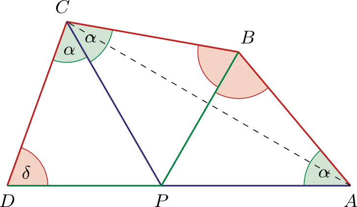 A \(\displaystyle BCD\) szögfelezője messe az \(\displaystyle AD\) oldalt a \(\displaystyle P\) pontban. Az \(\displaystyle ABCP\) négyszög deltoid, mivel \(\displaystyle AB=BC\) és a \(\displaystyle BCD\sphericalangle\) felezése után \(\displaystyle DAB\sphericalangle=BCP\sphericalangle=\alpha\). Ezzel beláttuk, hogy \(\displaystyle CP=PA\) is teljesül.