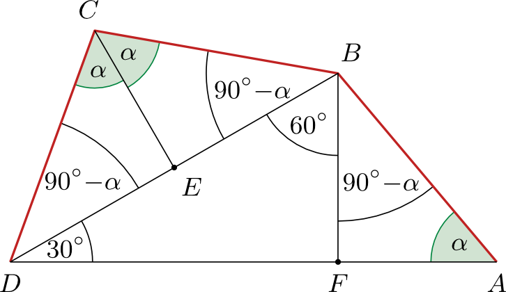 Tudjuk, hogy \(\displaystyle BC=CD\), így \(\displaystyle EC\) a \(\displaystyle BD\) szakaszfelező merőlegese, \(\displaystyle BE=ED\) és \(\displaystyle BCE\sphericalangle=ECD\sphericalangle=\alpha\). Az \(\displaystyle ABF, BCE, DCE\) derékszögű háromszögek átfogói ugyanakkorák és egy hegyesszögük \(\displaystyle \alpha\), tehát egybevágók. Így \(\displaystyle FB=BE=ED\) és a \(\displaystyle BFD\) derékszögű háromszög átfogója kétszerese az \(\displaystyle FB\) befogónak, a háromszög félszabályos. Ezután az állításban szereplő szögek: