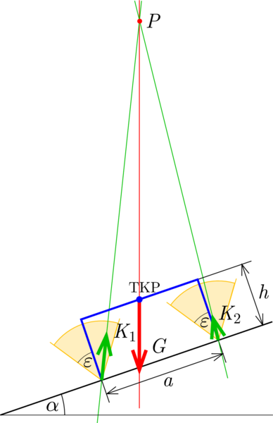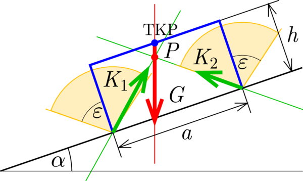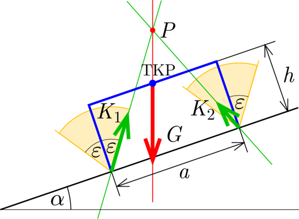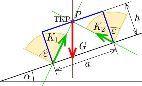 II. megoldás. Ha az egyes lábaknál ható kényszererőket egyetlen erőként (\(\displaystyle \boldsymbol{K}_1\), illetve \(\displaystyle \boldsymbol{K}_2\)) tekintjük, akkor a testre a \(\displaystyle \boldsymbol{G}\) nehézségi erővel együtt összesen három erő hat. Három nem párhuzamos irányú erő csak akkor lehet egyensúlyban, ha a hatásvonalaik egy pontban metszik egymást (különben az egyik erőnek forgatónyomatéka lenne a másik két erő metszéspontjára vonatkoztatva), és így a feladat az egyenletek és egyenlőtlenségek felírása nélkül is megoldható. Ehhez még szükségünk van az \(\displaystyle \varepsilon\) súrlódási határszög fogalmára: ahhoz, hogy az \(\displaystyle |S|\leq\mu N\) egyenlőtlenség teljesüljön, a \(\displaystyle \boldsymbol{K}\) kényszererő (amely az egymásra merőleges \(\displaystyle \boldsymbol{N}\) és \(\displaystyle \boldsymbol{S}\) erők eredője) legfeljebb \(\displaystyle \varepsilon=\arctg\mu\) szöget zárhat be a felület normálisával.