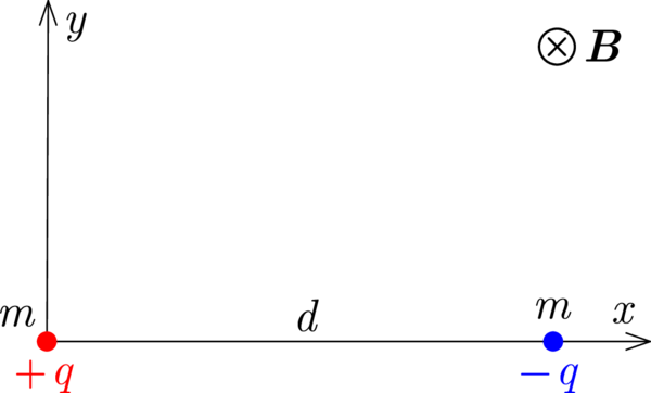 3. Két azonos \(\displaystyle m\) tömegű, \(\displaystyle +q\) és \(\displaystyle -q\) töltésű pontszerű test kezdetben egymástól \(\displaystyle d\) távolságra, nyugalomban van. Ha a testeket egyszerre elengedjük, akkor egy idő után összeütköznek. Ha a kísérletet megfelelő erősségű, a testeket összekötő szakaszra merőleges irányú, homogén mágneses mező jelenlétében ismételjük meg, akkor a testek nem ütköznek össze.
