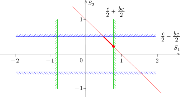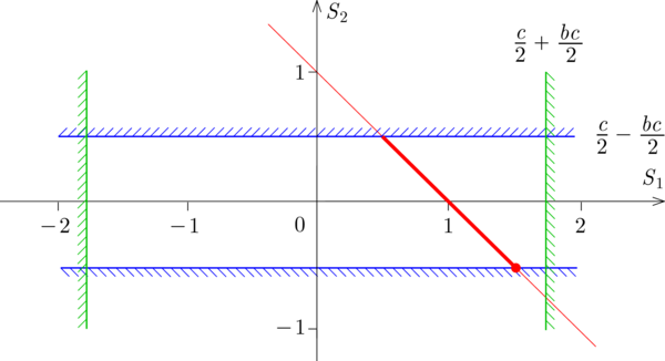 Az \(\displaystyle S_1\) és \(\displaystyle S_2\) lehetséges értékpárjait a piros vonal téglalapon belüli (megvastagított) része jelöli ki.