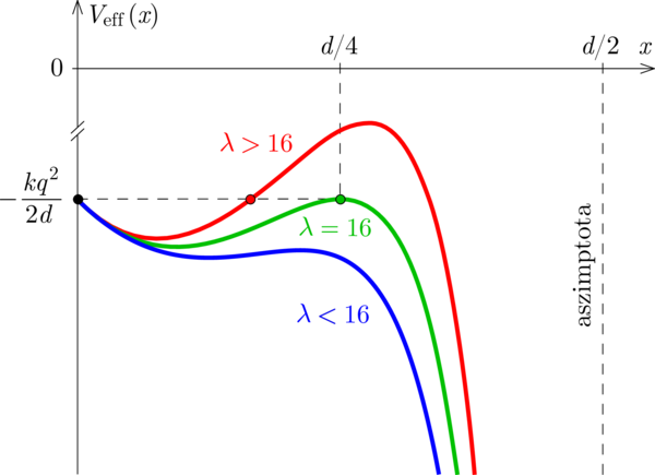 Vezessük be a \(\displaystyle \lambda=\tfrac{B^2d^3}{km}\) dimenziótlan paramétert! A \(\displaystyle V_{\mathrm{eff}}(x)\) grafikon alakja és a mozgás jellege nagyban függ \(\displaystyle \lambda\) értékétől. A függvény \(\displaystyle x\to d/2\) esetén \(\displaystyle -\infty\)-hez tart, ez a helyzet felel meg a két test összeütközésének. Kis \(\displaystyle \lambda\) (gyenge mágneses tér) esetén a (13) kifejezés zárójelében lévő második tag dominál, így a függvény szigorúan monoton csökken. Ha \(\displaystyle \lambda\) értékét (és ezzel együtt \(\displaystyle B\) nagyságát) fokozatosan növeljük, akkor a zárójelben lévő első, \(\displaystyle x\)-ben másodfokú tag erősödik, majd a \(\displaystyle V_{\mathrm{eff}}(x)\) függvénynek a \(\displaystyle 0<x<d/2\) tartományban egy lokális maximuma jelenik meg. Részletesebb függvényvizsgálattal kiderül, hogy \(\displaystyle \lambda<16\) esetén ennek a maximumnak az értéke \(\displaystyle E=-\tfrac{kq^2}{2d}\)-nél kisebb, \(\displaystyle \lambda=16\) esetén éppen ekkora, míg \(\displaystyle \lambda>16\) esetén a maximumértéke \(\displaystyle E\)-nél nagyobb (12. ábra).
