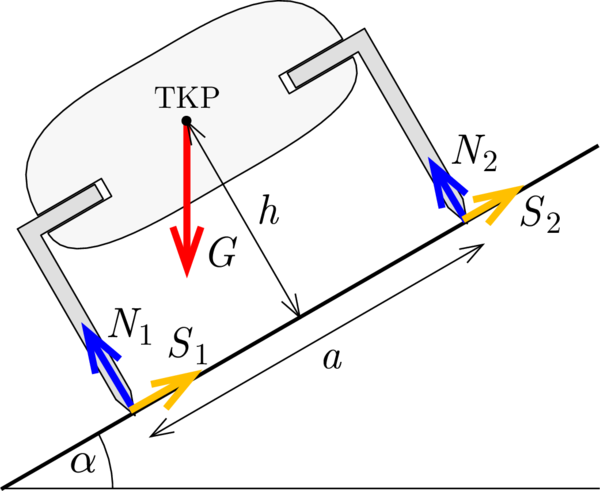 2. Az ábrán látható két lábbal rendelkező űrszonda egy \(\displaystyle \alpha\) hajlásszögű, sík, lejtős felületen landolt. Az űrszonda széles lábai a lejtő esésvonalára (és az ábra síkjára) merőleges két párhuzamos szakasz mentén érintkeznek a talajjal. A lábak és a lejtő között a súrlódási együttható \(\displaystyle \mu\). A teljes űrszonda tömegközéppontja \(\displaystyle h\) távolságra van a talajtól, a lábak távolsága egymástól kezdetben \(\displaystyle a\). Az űrszonda egy belső szerkezet segítségével az ábrának megfelelően elkezdi kitolni a lábait (miközben azok mindvégig a talajra merőlegesek maradnak).