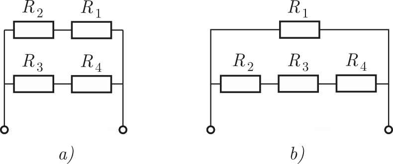 Megoldás. Számozzuk be fentről lefelé az ellenállásokat, és rajzoljuk át az áramkört mindkét esetben jobban áttekinthető formába (ábra).