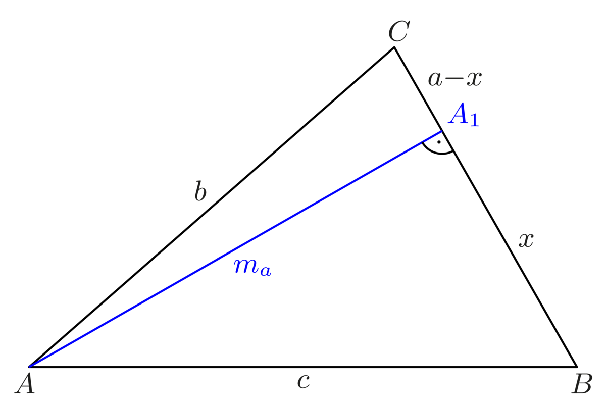 Ha a háromszöget megforgatjuk a \(\displaystyle BC\) oldal körül, akkor a keletkezett forgástest két, közös alaplapú kúp lesz, ahol a két kúp közös alaplapja egy \(\displaystyle m_a\) sugarú kör, a kúpok magassága az ábra jelöléseivel \(\displaystyle BA_1=x\), illetve \(\displaystyle A_1C=a-x\). A két kúp térfogatának összege ezért