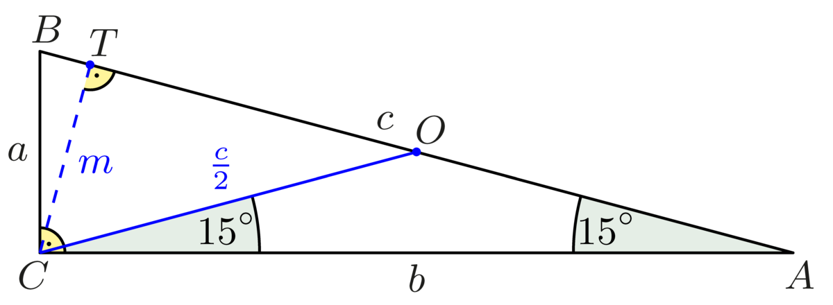 A körülírt kör sugara nyilván \(\displaystyle OA=OB=OC=\dfrac{c}{2}\), a feltétel miatt \(\displaystyle OCA\sphericalangle=CAO\sphericalangle=15^{\circ}\), ez pedig az \(\displaystyle OCA\) háromszög külső szögére vonatkozó tétel szerint azt jelenti, hogy \(\displaystyle COT\sphericalangle=30^{\circ}\). Ebből azonnal következik, hogy a \(\displaystyle COT\) derékszögű háromszög egy félszabályos háromszög, vagyis \(\displaystyle \dfrac{c}{2}=2m\), ahonnan