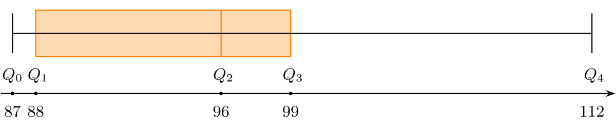 Megjegyzés. A \(\displaystyle Q_4=112\) adat nem kiugró adat, mert az \(\displaystyle IQR=Q_3-Q_1=11\) félterjedelemmel számolva \(\displaystyle 112<Q_3+1{,}5\cdot IQR=99+1{,}5\cdot 11=115{,}5\).