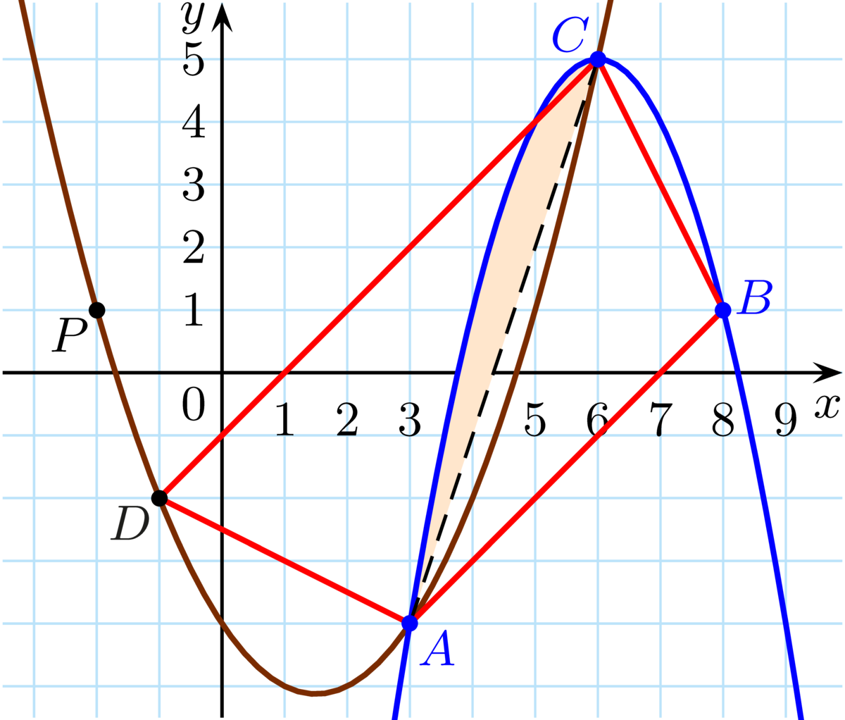 A (4) egyenletrendszer megoldása \(\displaystyle a=-1\); \(\displaystyle b=12\); \(\displaystyle c=-31\), az (5) egyenletrendszer megoldása pedig \(\displaystyle d=\dfrac{1}{2}\); \(\displaystyle e=-\dfrac{3}{2}\); \(\displaystyle f=-4\). Az \(\displaystyle y=-x^2+12x-31\) és az \(\displaystyle y=\dfrac{1}{2}x^2-{\dfrac{3}{2}x-4}\) parabola két közös pontja \(\displaystyle A\) és \(\displaystyle C\), elhelyezkedésüket szemlélteti az ábra. Eszerint az \(\displaystyle y=\frac{1}{2}x^2-\frac{3}{2}x-4\) parabolára a \(\displaystyle D\) pont is illeszkedik, ez számítással igazolható, de a feladat további részéhez nem kell felhasználnunk.