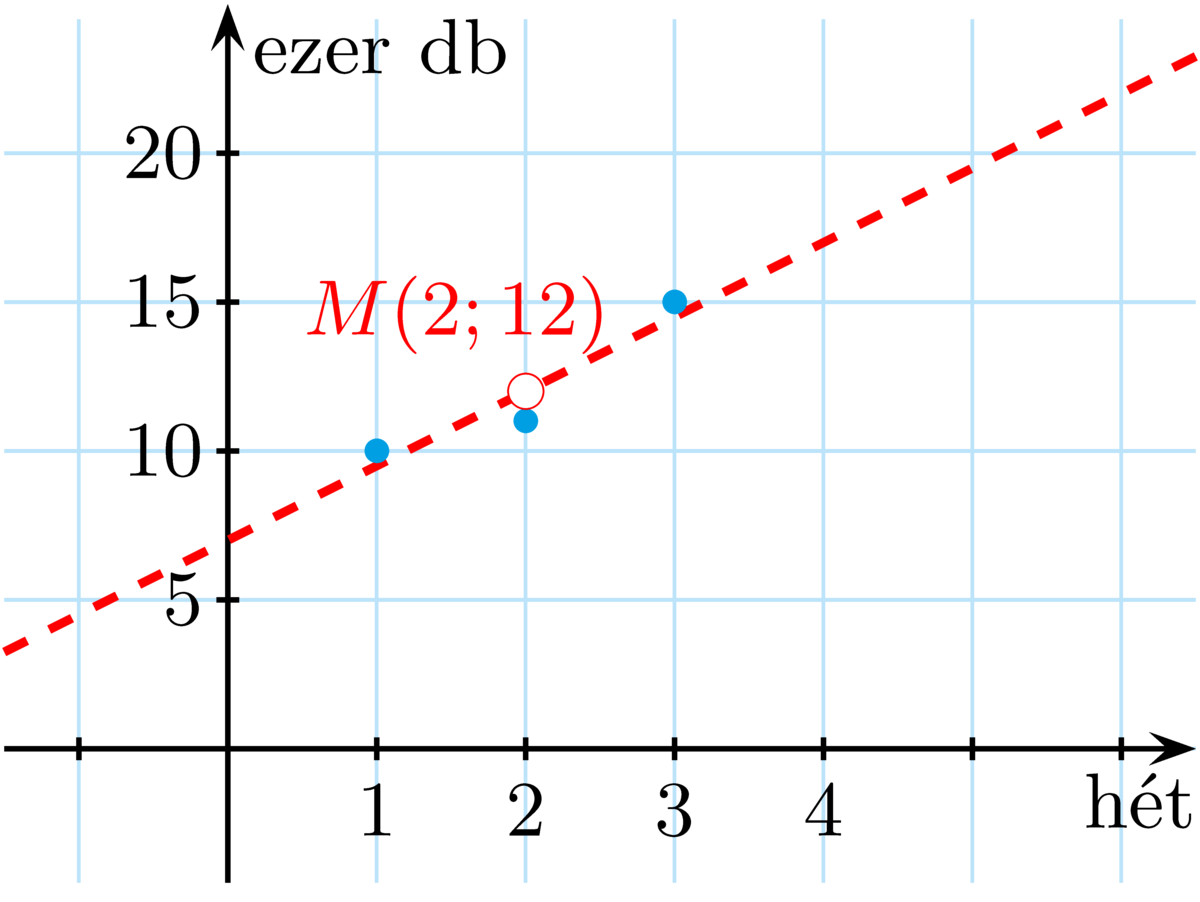 b) Adjon meg egy olyan elsőfokú függvényt, amelynek grafikonja átmegy az \(\displaystyle M(2;12)\) ponton, és amely az \(\displaystyle x_{1}=1\); \(\displaystyle x_{2}=2\); \(\displaystyle x_{3}=3\) helyen olyan értéket vesz fel, amelynek az \(\displaystyle y_{1}=10\); \(\displaystyle y_{2}=11\); \(\displaystyle y_{3}=15\) értékektől való eltérésének négyzetösszege a lehető legkisebb. (9 pont)