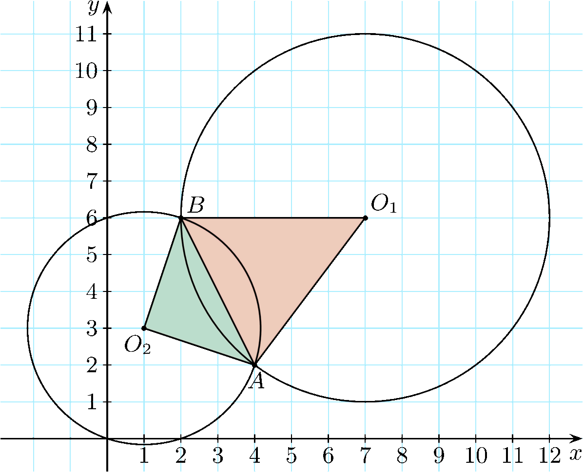 6. Koordináta-rendszerbe rajzolunk két körvonalat. A körök egyenlete \(\displaystyle x^2+y^2-14x-12y+60=0\) és \(\displaystyle x^2+y^2-2x-6y=0\). A nagyobb sugarú kör középpontja legyen \(\displaystyle O_1\), a kisebb sugarú kör középpontja legyen \(\displaystyle O_2\). A két kör metszéspontjait jelölje \(\displaystyle A\) és \(\displaystyle B\).