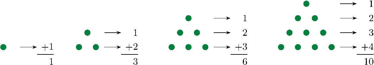 7. Háromszögszámnak nevezzük az olyan számot, amelyet megkaphatunk úgy, hogy \(\displaystyle 1\)-től valameddig az összes természetes számot összeadjuk. Az első \(\displaystyle n\) pozitív egész szám összege az \(\displaystyle n\)-edik háromszögszám. Az ábrán látható elrendezés mutatja, hogy miért nevezik háromszögszámoknak.