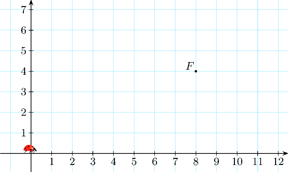 2. Egy online játékban a koordináta-rendszer origójából kell eljutni a katicabogár figurával az \(\displaystyle F(8; 4)\) koordinátájú pontba. A katicabogárral minden lépésben csak jobbra vagy felfelé léphetünk egyet.