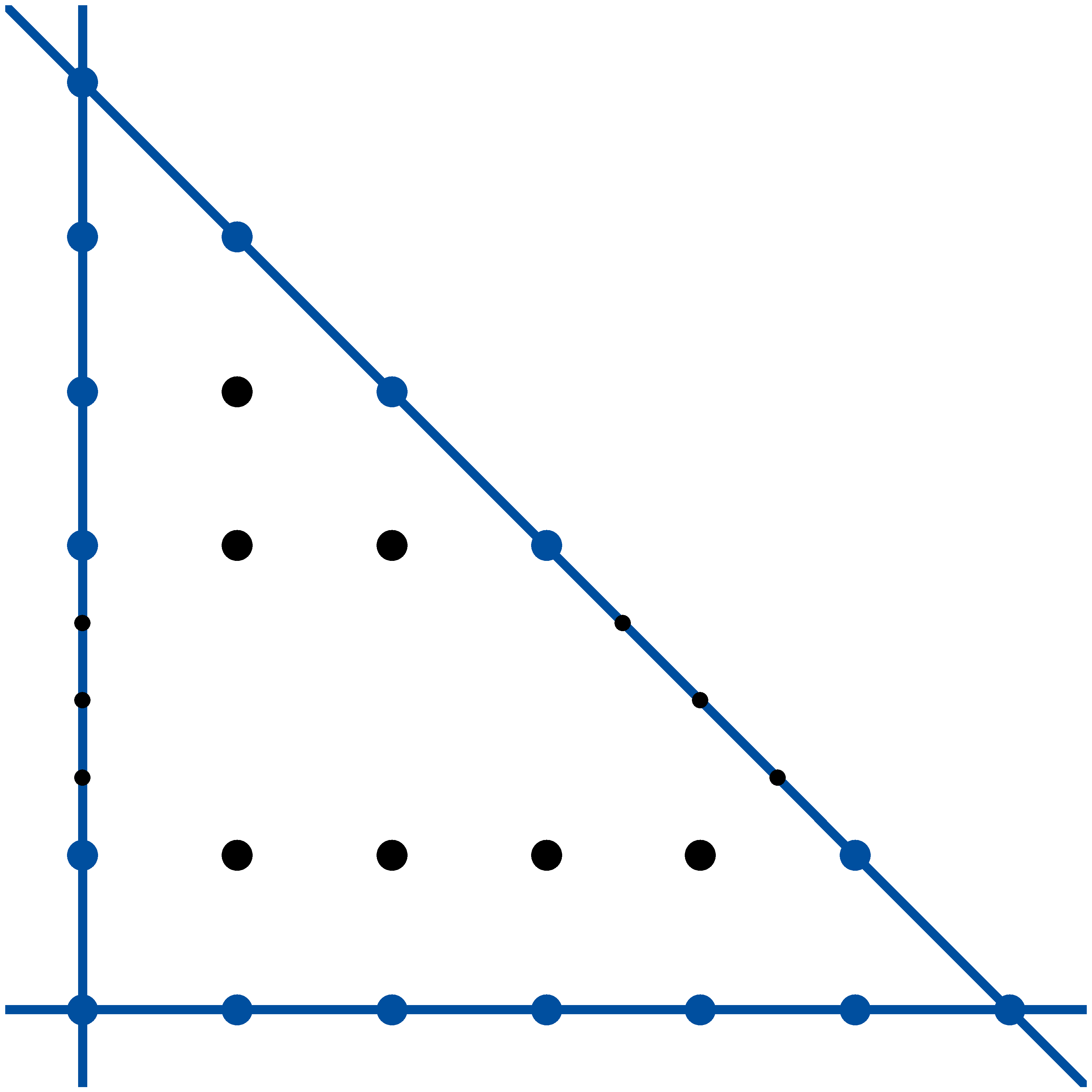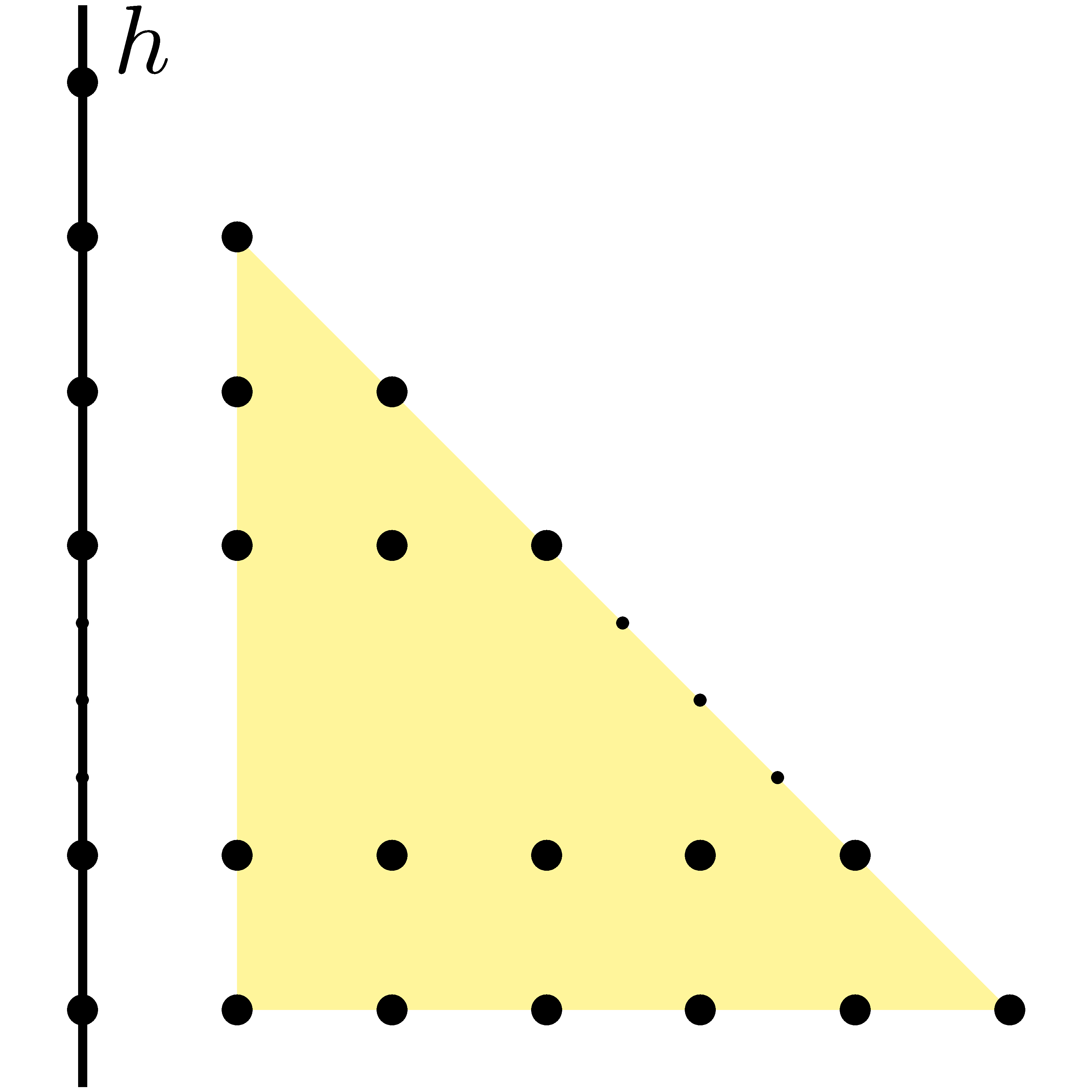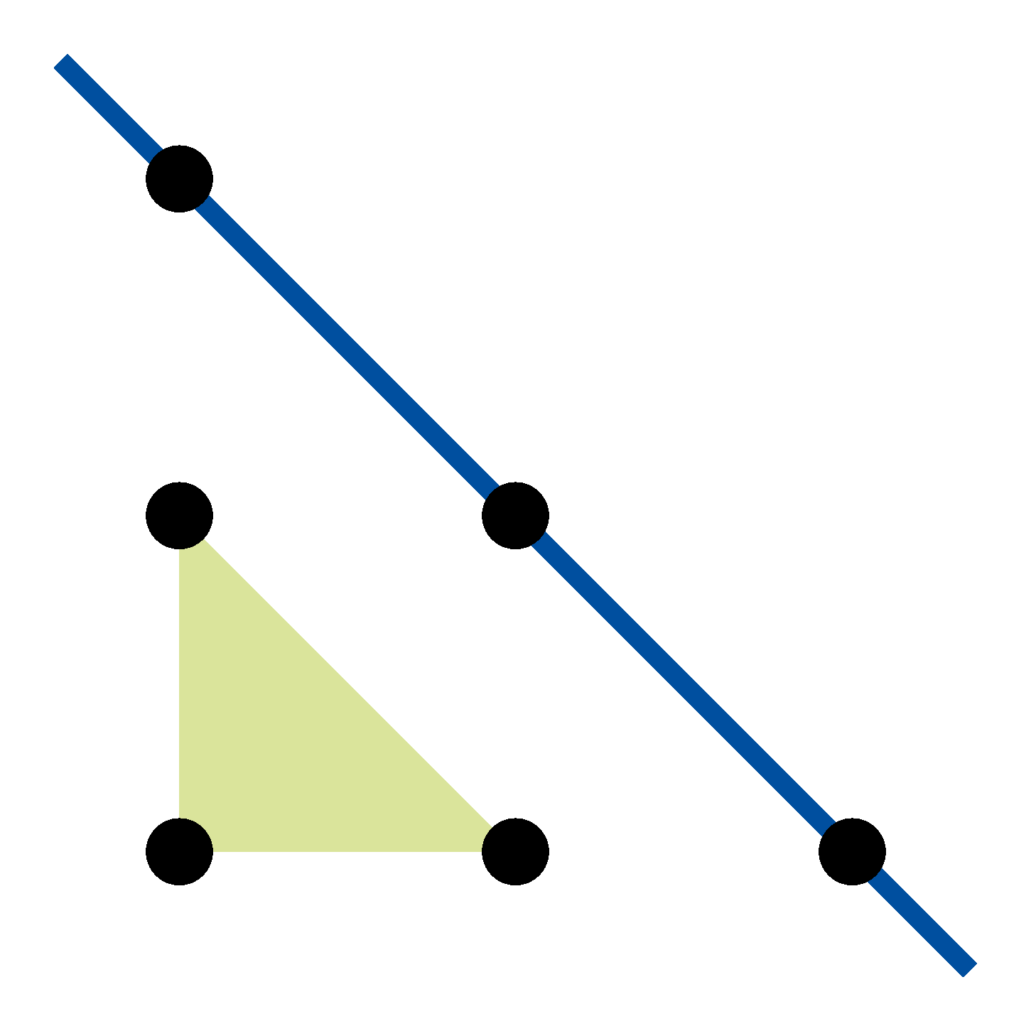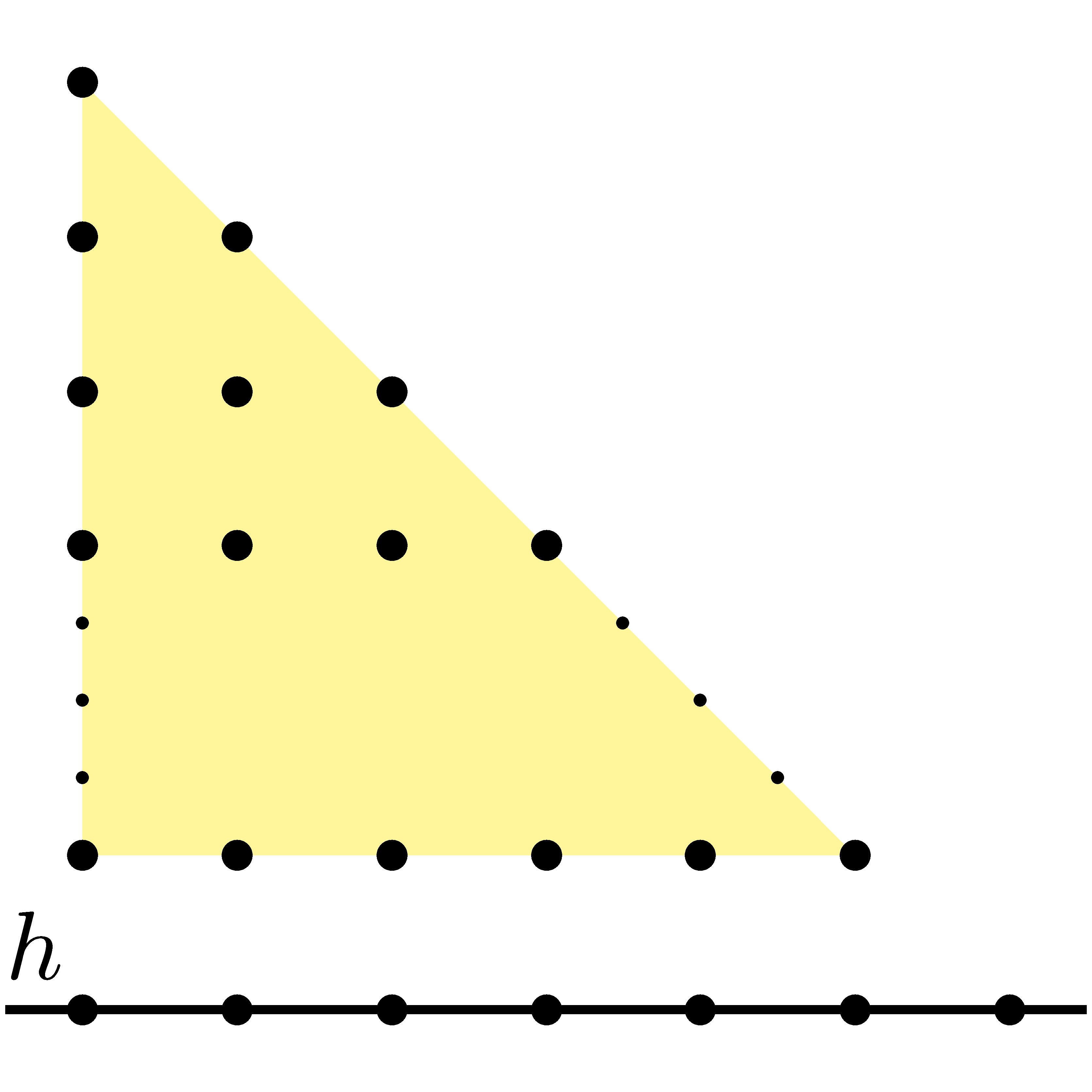A feladatban megadott rácspontokat egy derékszögű egyenlő szárú háromszögben ábrázolhatjuk. A továbbiakban ezeket a pontokat fogjuk rácspontnak hívni. A definíció szerint egy egyenes akkor napfényes, ha nem párhuzamos a háromszög egyik oldalával sem.