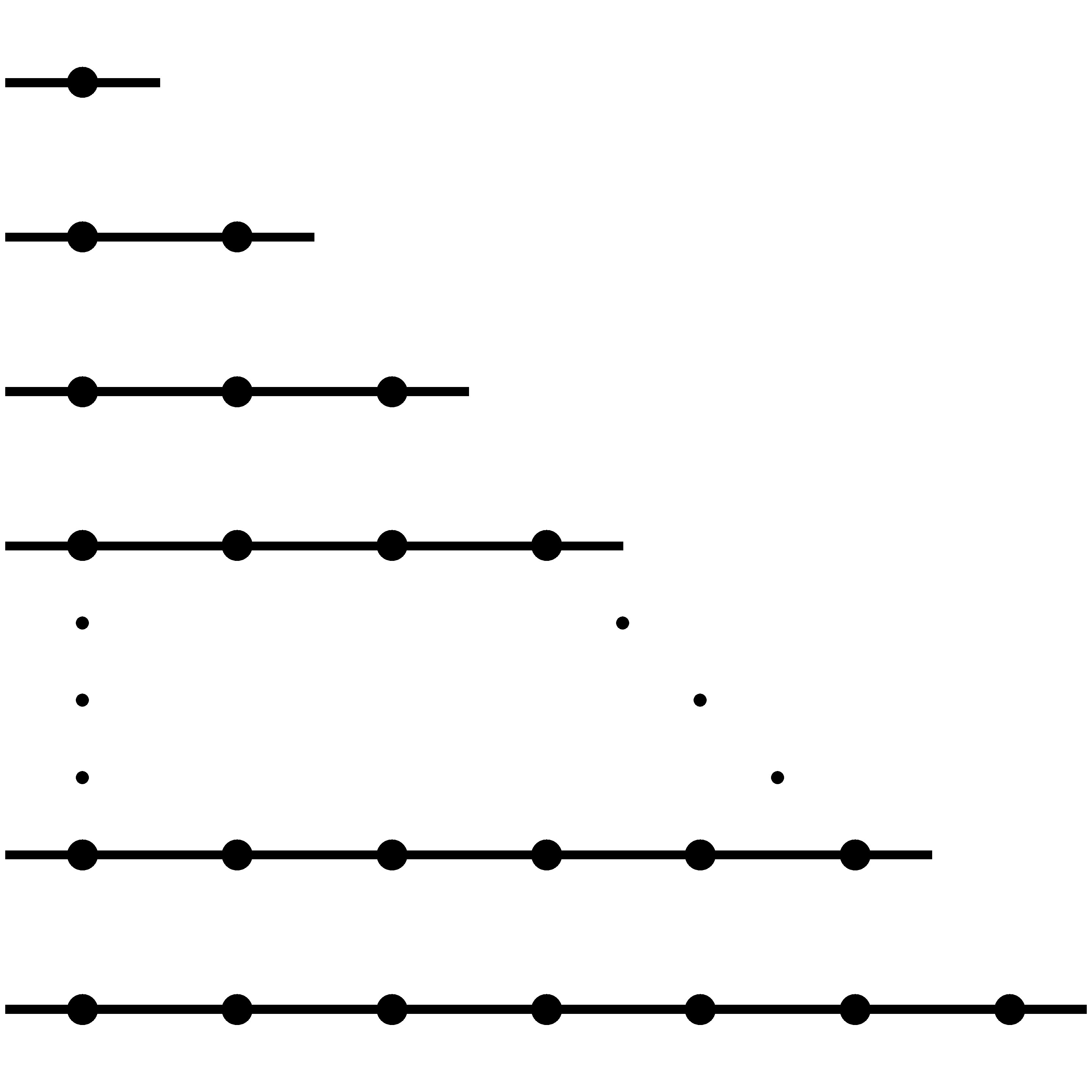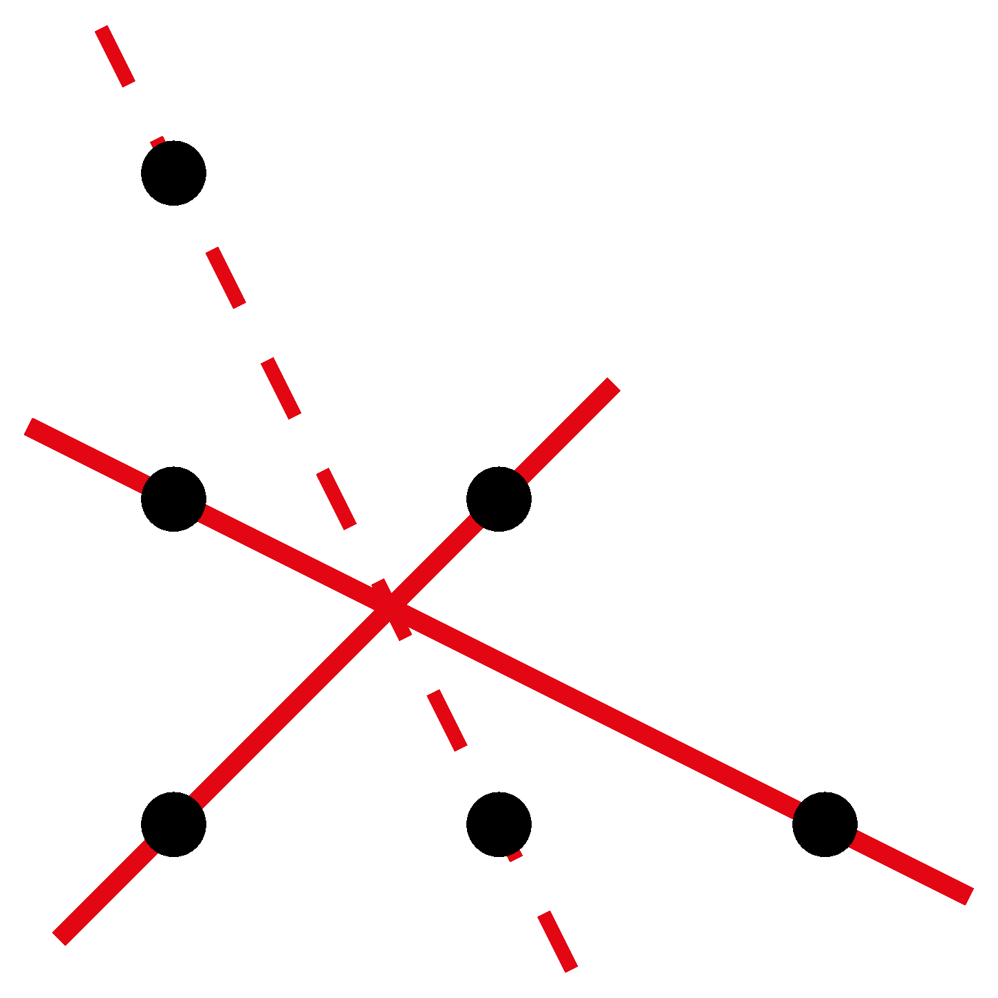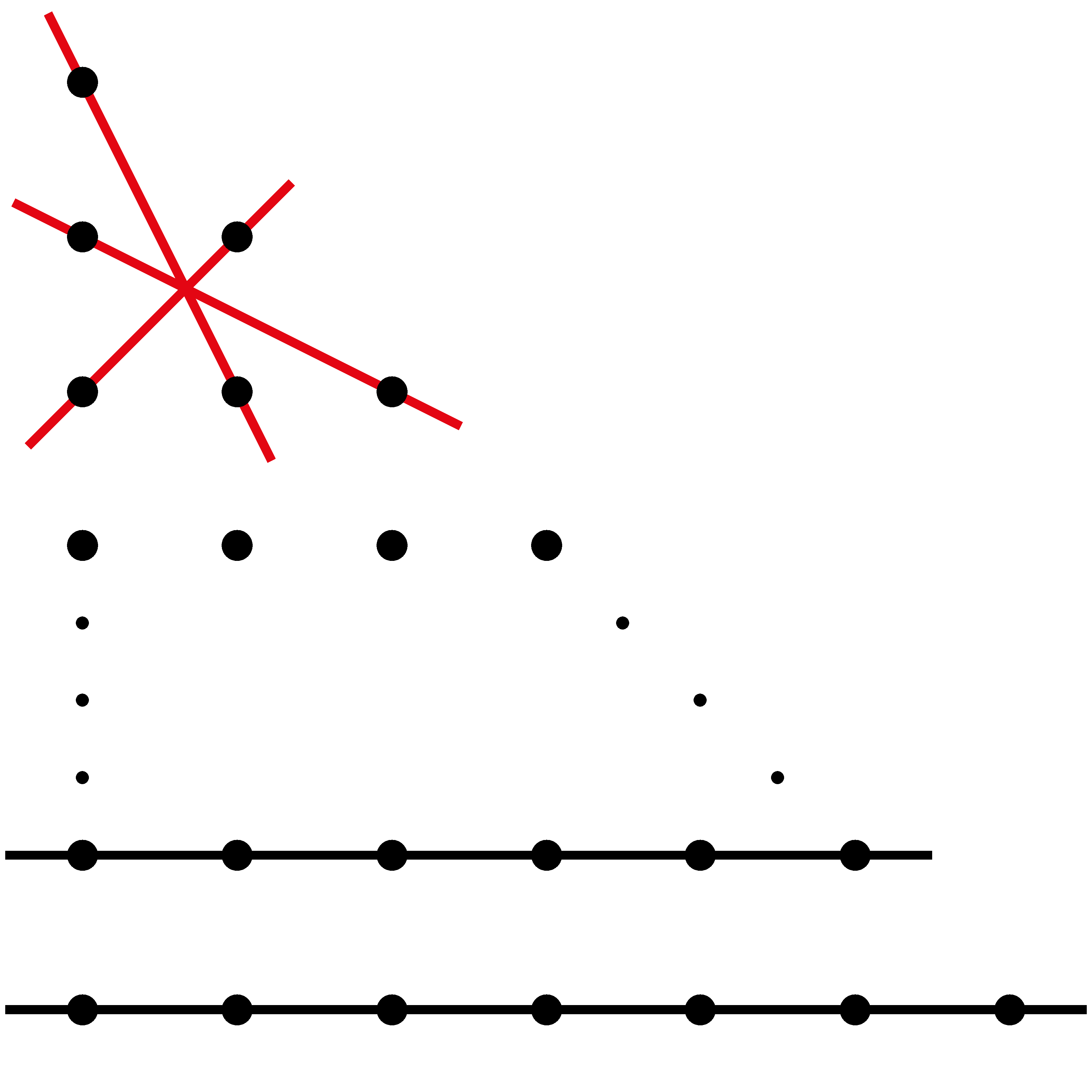 Vegyük észre, hogy összesen csak három olyan napfényes egyenes létezik, amely pontosan két rácsponton megy keresztül; ha ezek közül kettőt megrajzolunk, a megmaradt két rácspontot a harmadik napfényes egyenessel kell lefednünk. Ebben az esetben tehát vagy kettőnél kevesebb, vagy pedig mindhárom napfényes egyenest fel kell használnunk; \(\displaystyle k=2\) nem lehetséges. Ezzel az \(\displaystyle n=3\), \(\displaystyle k=2\) eset vizsgálatával kész vagyunk.