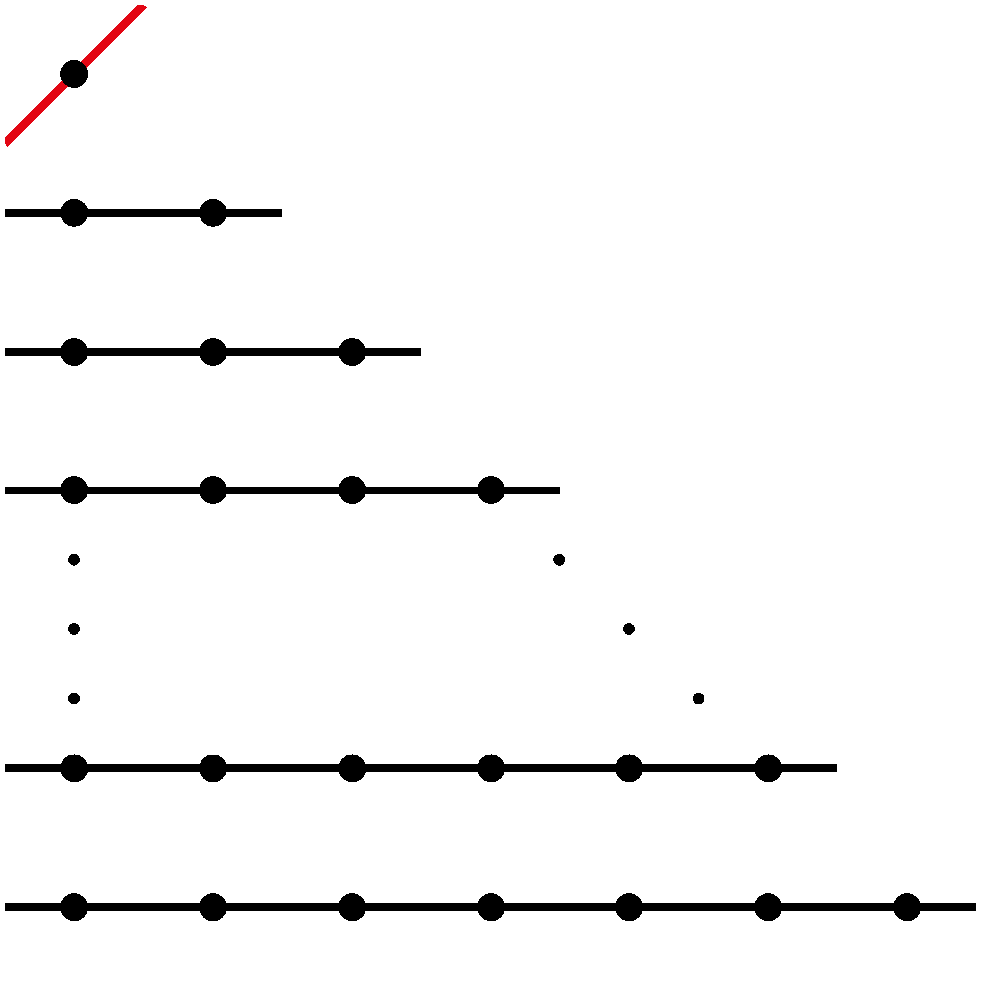 Először mutatunk egy-egy példát arra, hogy a rácspontokat le lehet fedni \(\displaystyle n\) olyan egyenessel, amelyek közül pontosan \(\displaystyle k=0\), \(\displaystyle k=1\), illetve \(\displaystyle k=3\) napfényes. Az egyeneseknek egy-egy ilyen elrendezése látható az alábbi ábrákon; a napfényes egyeneseket piros színnel rajzoltuk.