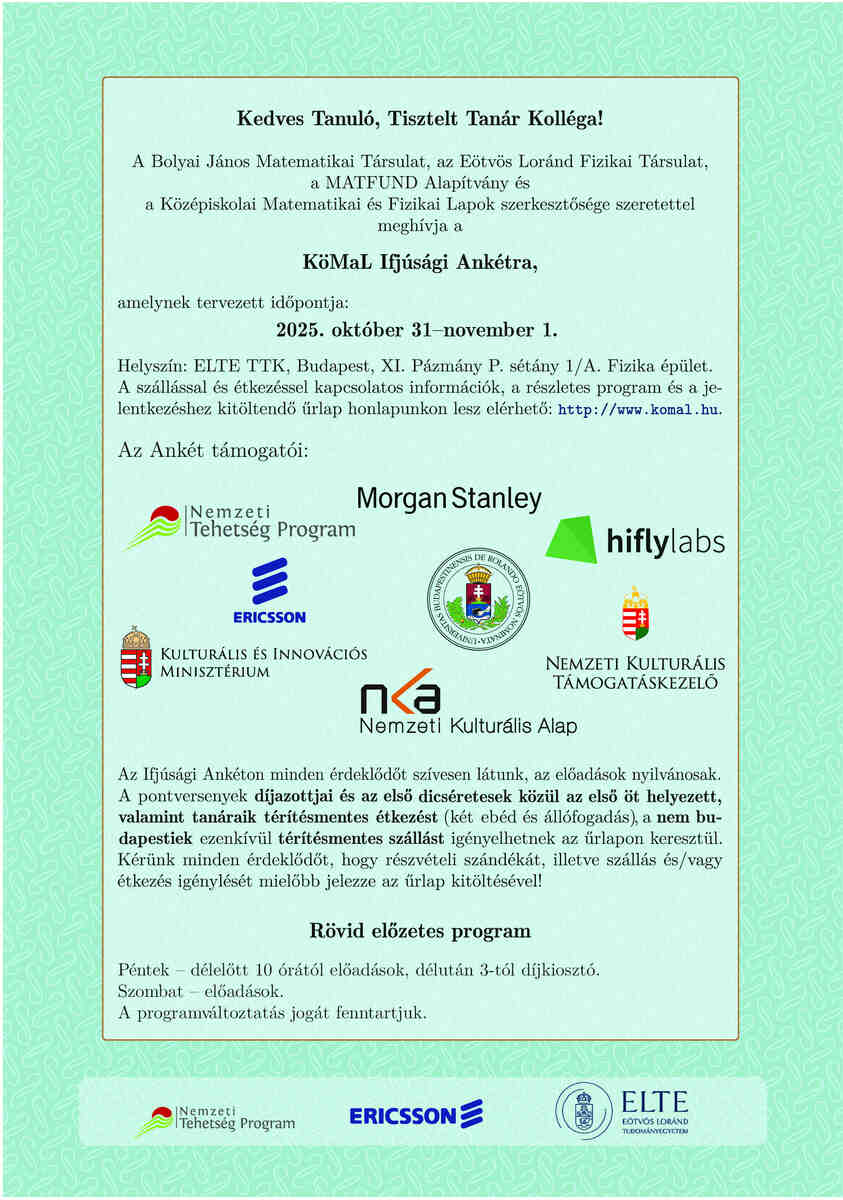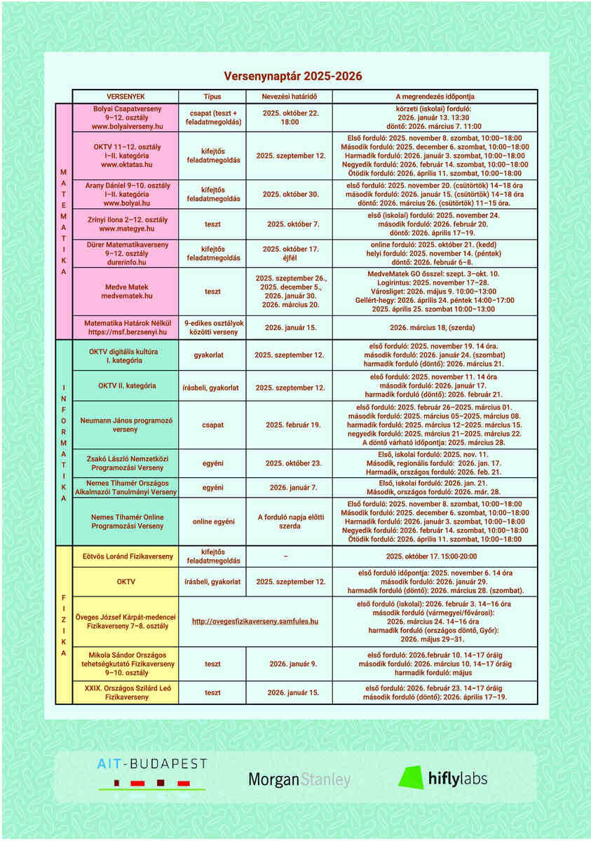 We announce contests in mathematics, physics and informatics, altogether in 20 categories with different difficulties. Each contest lasts for 9 months, from September 2025 until the beginning of June 2026; new problems are posted in every month from September to May, and solutions can be submitted before early next month.
