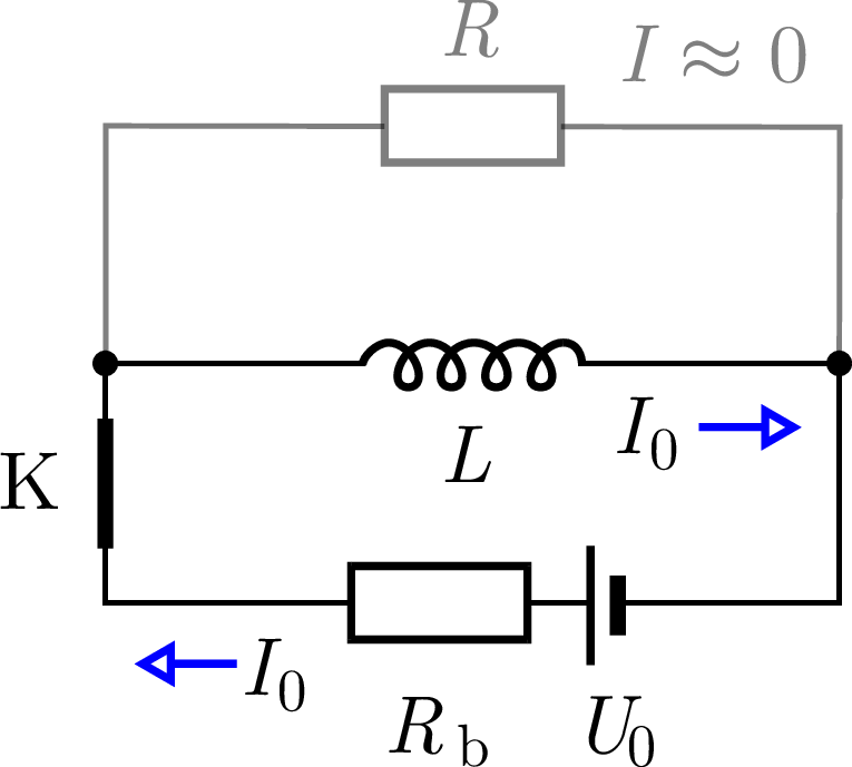 a) A kapcsoló nyitása után (2. ábra) a tekercs árama nem változhat ugrásszerűen, így a \(\displaystyle t=0\) időpillanatban az \(\displaystyle RL\)-körben \(\displaystyle I_0\) áram folyik. Ezután egy ideig a tekercs feszültségforrásként viselkedik, és áramot hajt át az \(\displaystyle R\) ellenálláson: