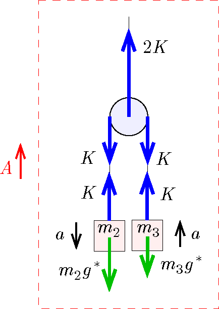 II. megoldás. Vizsgáljuk a mozgást a jobb oldali csigával együtt mozgó vonatkoztatási rendszerben. A csiga gyorsulása legyen \(\displaystyle A\), így ebben a rendszerben vizsgálva a mozgást az \(\displaystyle m_i\) tömegű testre az \(\displaystyle m_ig\) nehézségi erőn kívül egy \(\displaystyle m_iA\) nagyságú, lefelé mutató tehetetlenségi erő hatását is figyelembe kell vennünk, tehát olyan, mintha a nehézségi gyorsulás értéke \(\displaystyle g^\star=g+A\) lenne.
