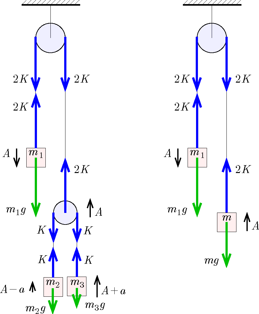Itt \(\displaystyle A\) az \(\displaystyle m_1\) tömegű test, a köteléhez kapcsolódó csiga, valamint a keresett \(\displaystyle m\) helyettesítő tömeg gyorsulása, \(\displaystyle a\) az \(\displaystyle m_2\) és \(\displaystyle m_3\) tömegek gyorsulása a mozgócsigához viszonyítva, \(\displaystyle K\) pedig a mozgócsigán átvetett kötélben a kötélerő. Az 1. ábra bal oldalán az eredeti, a jobb oldalán a helyettesítő elrendezés látható (\(\displaystyle m_2>m_3\) és \(\displaystyle m_1>m\), és ebből következően \(\displaystyle A>0\) és \(\displaystyle a>0\) választással, de ennek a megoldás szempontjából nincs jelentősége).