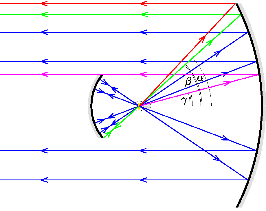 Az ábrán három különböző szöget jelöltünk be: \(\displaystyle \alpha\) és \(\displaystyle \beta\) a nagy, illetve a kis tükör pereméhez húzott sugarak optikai tengellyel bezárt szöge, \(\displaystyle \gamma\) pedig annak a sugárnak a szöge, amely a parabolatükörről visszaverődve éppen a kis tükör peremét érinti. Erre azért van szükségünk, mert az ennél kisebb szögben induló fénysugarakat a kis tükör kitakarja. A kinyomtatott ábrán lemérve: