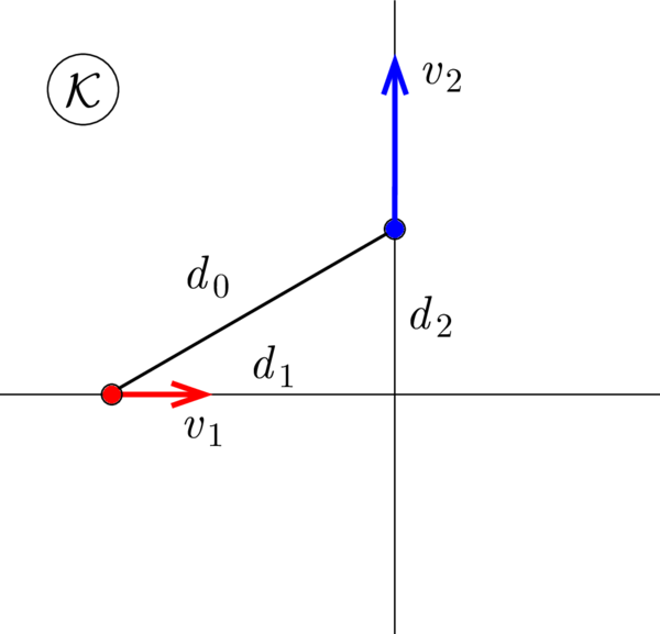 II. megoldás. Amikor a két motoros között minimális a távolság (\(\displaystyle t_0\) időpont), akkor az egyik motoros közeledik a kereszteződéshez, a másik pedig távolodik a kereszteződéstől. (Ha mindketten közelednének vagy távolodnának, akkor nem lehetne minimális a távolság. ) Legyen ekkor az egyik motoros távolsága a kereszteződéstől \(\displaystyle d_1\), és tegyük fel, hogy ő távolodik \(\displaystyle v_1\) sebességgel, a másik motoros távolsága pedig \(\displaystyle d_2\), és tegyük fel, hogy ő közeledik a kereszteződéshez \(\displaystyle v_2\) sebességgel. Ekkor a Pitagorasz-tételből: