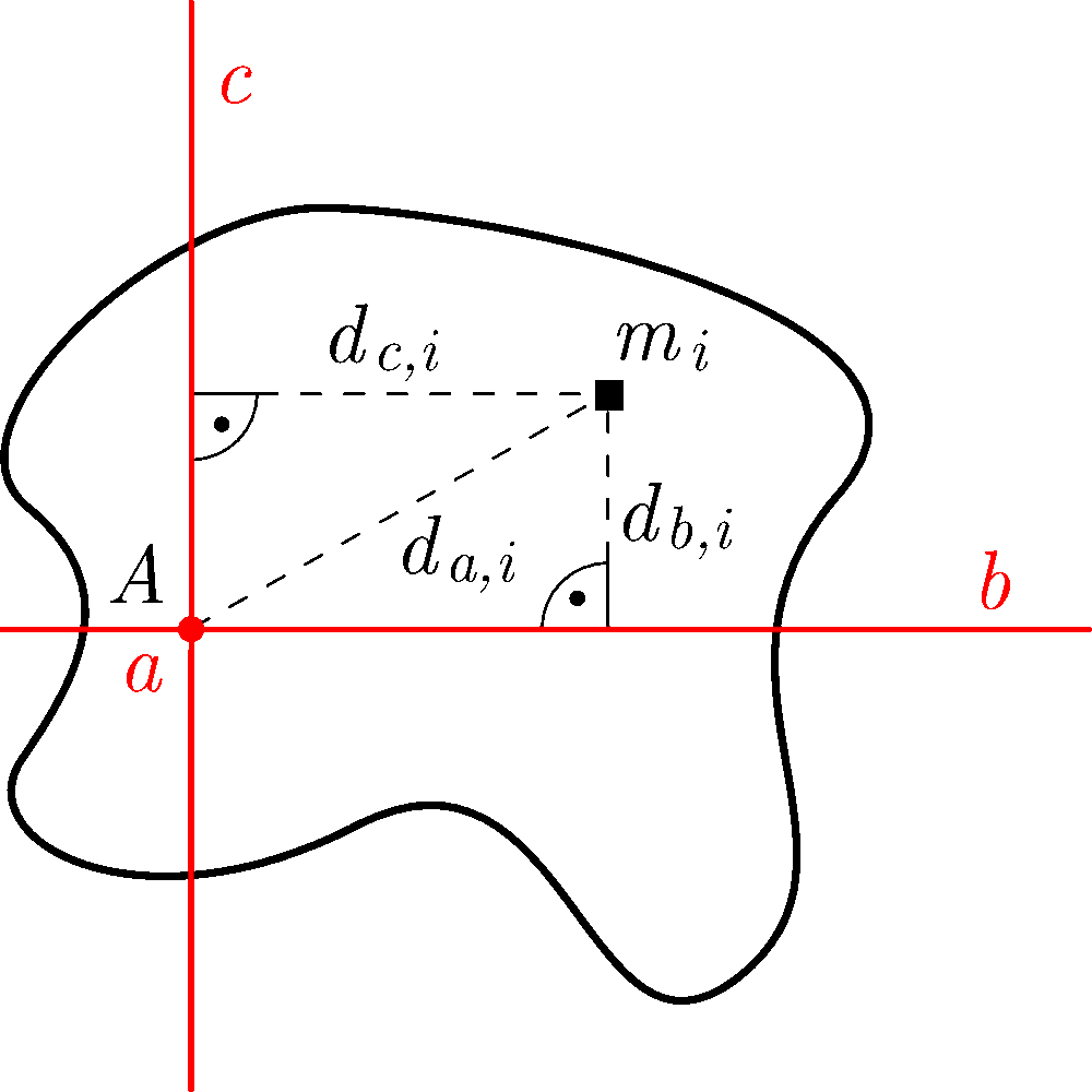 Megjegyzések. 1. A merőleges tengelyek tétele könnyen levezethető a tehetetlenségi nyomaték definíciója alapján. Egy síkidom tehetetlenségi nyomatéka bármely tengelyre a \(\displaystyle \Theta=\sum m_id_i^2\) összefüggéssel számítható ki, ahol \(\displaystyle d_i\) az adott kis tömegelem távolsága a kiválasztott tengelytől. A 4. ábrán látható, hogy a síklapra merőleges \(\displaystyle a\) tengelytől mért \(\displaystyle d_{a,i}\) távolságra fennáll, hogy \(\displaystyle d_{a,i}^2=d_{b,i}^2+d_{c,i}^2\), ahol \(\displaystyle d_{b,i}\) és \(\displaystyle d_{c,i}\) a síkban lévő, egymásra merőleges \(\displaystyle b\) és \(\displaystyle c\) tengelyektől mért távolságok. Ebből és a tehetetlenségi nyomaték fenti összegzős képletéből azonnal adódik a \(\displaystyle \Theta_{{a}}=\Theta_{{b}}+\Theta_{{c}}\) összefüggés.