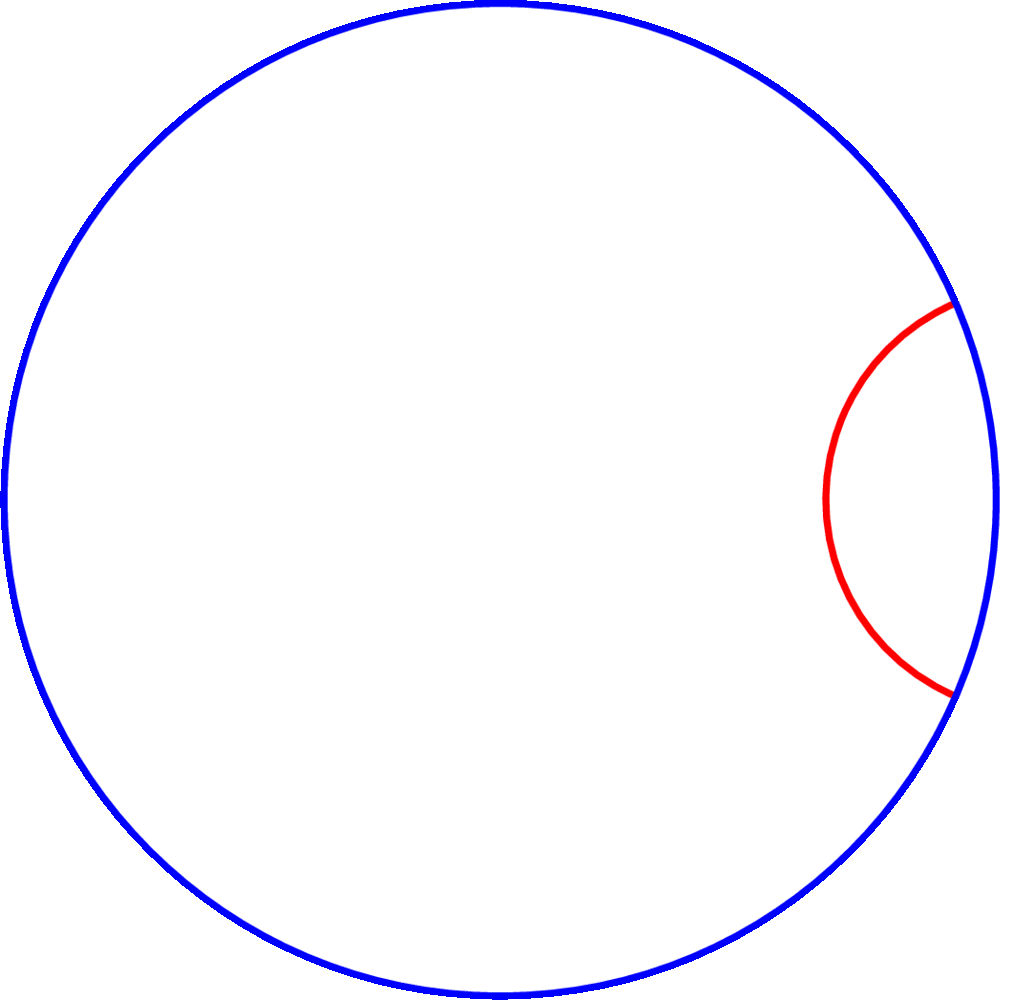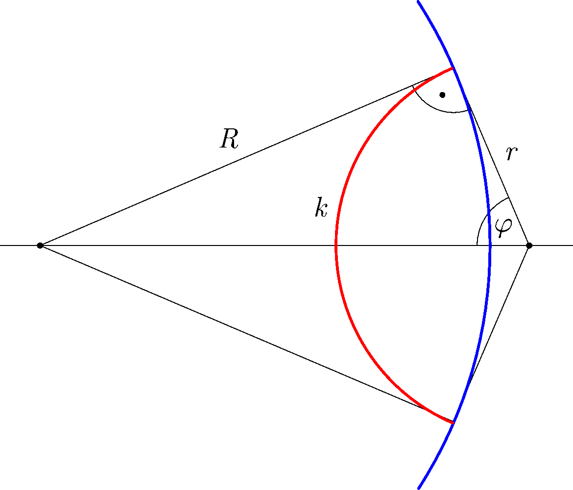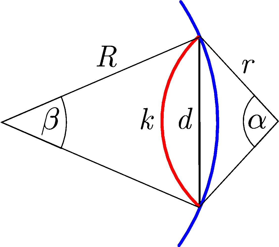 Legyen a \(\displaystyle k=1~\mathrm{km}\) hosszúságú piros körív sugara \(\displaystyle r\), a \(\displaystyle d\) hosszú húrhoz tartozó középponti szög pedig \(\displaystyle \alpha\) (5. ábra). A koszinusztételből: