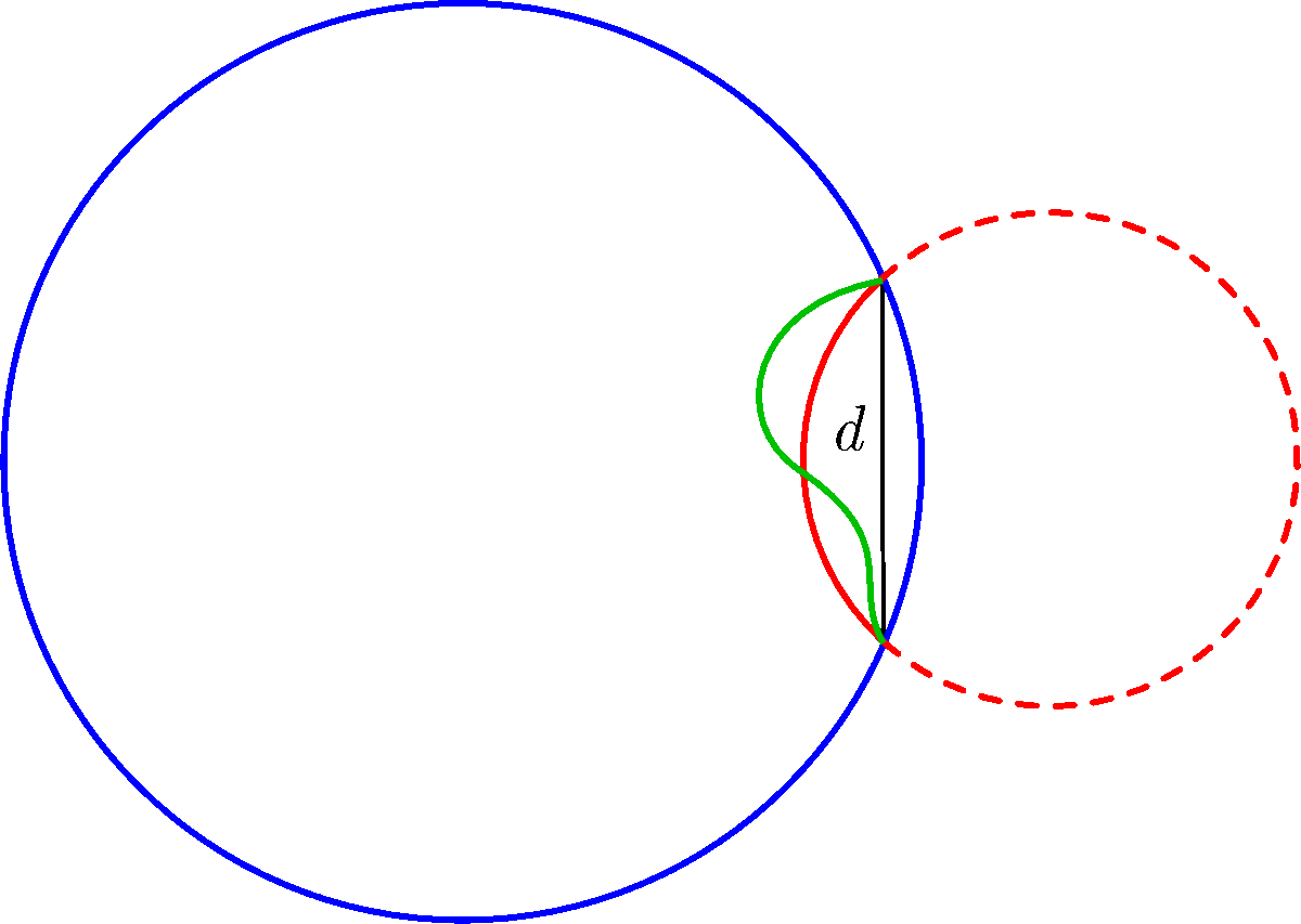 II. megoldás. Tegyük fel, hogy a kerítés két vége \(\displaystyle d\) távolságra van egymástól (4. ábra). Rajzoljunk be egy ezeken áthaladó, \(\displaystyle k=1~\mathrm{km}\) hosszúságú tetszőleges görbét (zöld vonal), és egy ugyanilyen hosszúságú körívet (piros vonal). Egészítsük ki a körívet egy körré (piros szaggatott vonal).